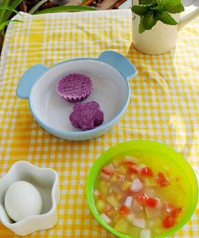 11、紫薯松糕+水果羹+白煮蛋