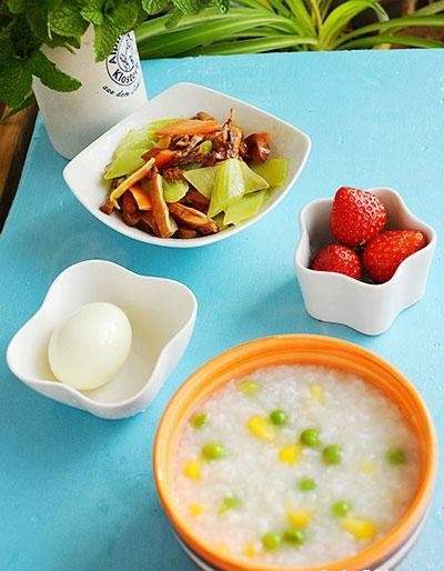 16、玉米青豆粥+胡蘿卜萵筍炒筍+白煮蛋+草莓
