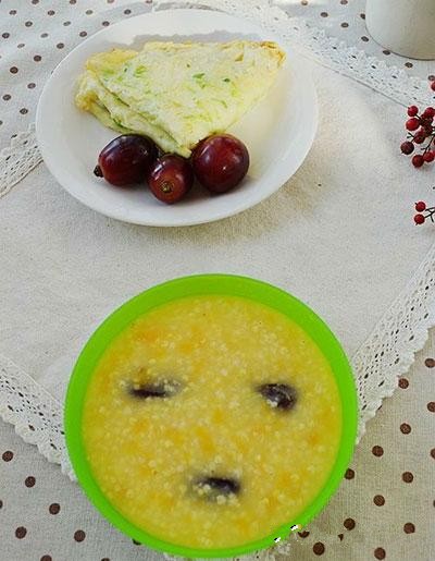 19、青瓜蛋餅+小米紅棗紅薯粥+提子