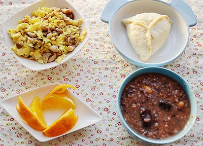 6、糖三角+八寶粥+小蘑菇炒蛋+橙