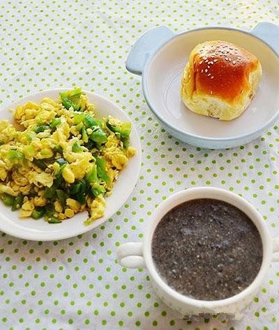 7、肉松面包+山藥黑豆核桃杏仁芝麻糊+青椒炒蛋
