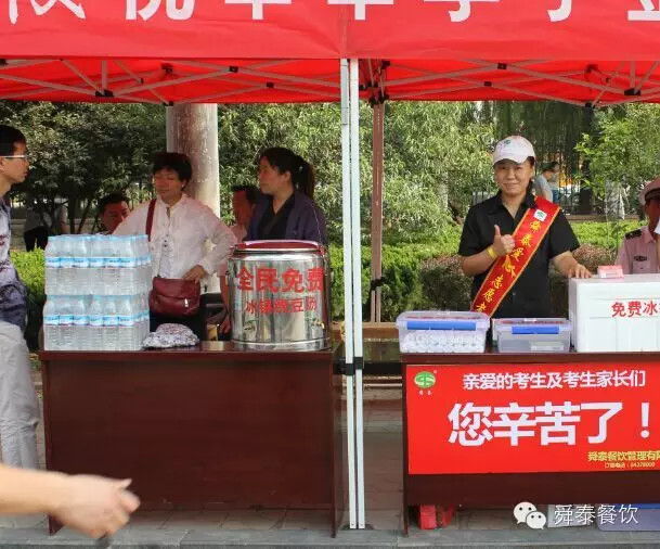 2015年6月7日是高考第一天,在氣溫高達(dá)34攝氏度的炎炎夏日里,濟(jì)南舜泰餐飲管理有限公司旗下舜泰火鍋、舜泰廚房的員工分別在濟(jì)陽(yáng)一中、濟(jì)陽(yáng)濟(jì)北中學(xué)兩個(gè)考點(diǎn)門前設(shè)立了“愛心送考休息站”,為應(yīng)考考生及陪同家長(zhǎng)、執(zhí)勤民警、送考司機(jī)們準(zhǔn)備了新鮮的綠豆湯、礦泉水、冰袋、冰毛巾和風(fēng)油精等防暑用品。本次活動(dòng)主要是為了解除高考學(xué)子的后顧之憂,為高考學(xué)子提供愛心支持,使他們能夠在圓大學(xué)夢(mèng)的同時(shí),感受更多的社會(huì)關(guān)愛。